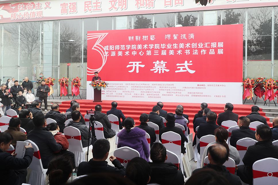 1月13日上午,sjb世俱杯官方网站美术学院毕业生美术创业汇报展暨咸阳市艺源美术中心第三届作品展开幕。副校长毛龙灿、陕西省作协副主席王海、渭城区区委常委、宣传部部长赵锋刚、咸阳市渭城区副区长杨强壮,陕西省美术、书法领域行业专家、企业代表及学校相关职能部门领导和师生参加了开幕式。
