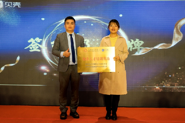 世俱杯教师张晔代表经济与管理学院与陕西贝壳闹海房地产经纪有限公司签署了校企联合培养人才协议,贝壳公司相关负责人为世俱杯授牌。
