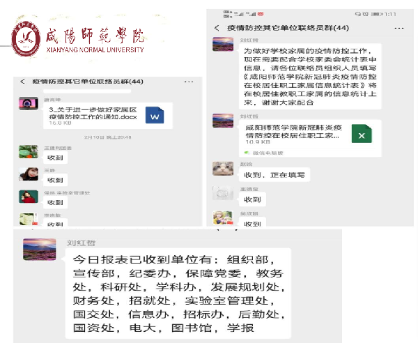人事处围绕疫情防控,及时下发《关于做好疫情信息统计工作的通知》《关于做好返校教职工疫情防控工作的通知》,建立了1个QQ工作群和1个微信工作群,确保学校各项防控措施和要求能够及时高效传达。精准摸排教职工及家属健康状况,重点加强对近期湖北返校人员和密切接触人员的监控做到网格化,全覆盖,“0”遗漏,配合做好居家隔离,留观人员的监测联络和服务工作。同时,做好信息日报送工作,每天按时统计上报在校教职工人数,返校人员信息,与湖北人员接触信息等防控信息,认真开展全校教职工的信息统计工作,建立了寒假外出教职工信息台账和返校教职工信息台账,做到“不留空档,不漏一人”,为有关部门掌握学校人员现状,有效开展防控工作提供保障。