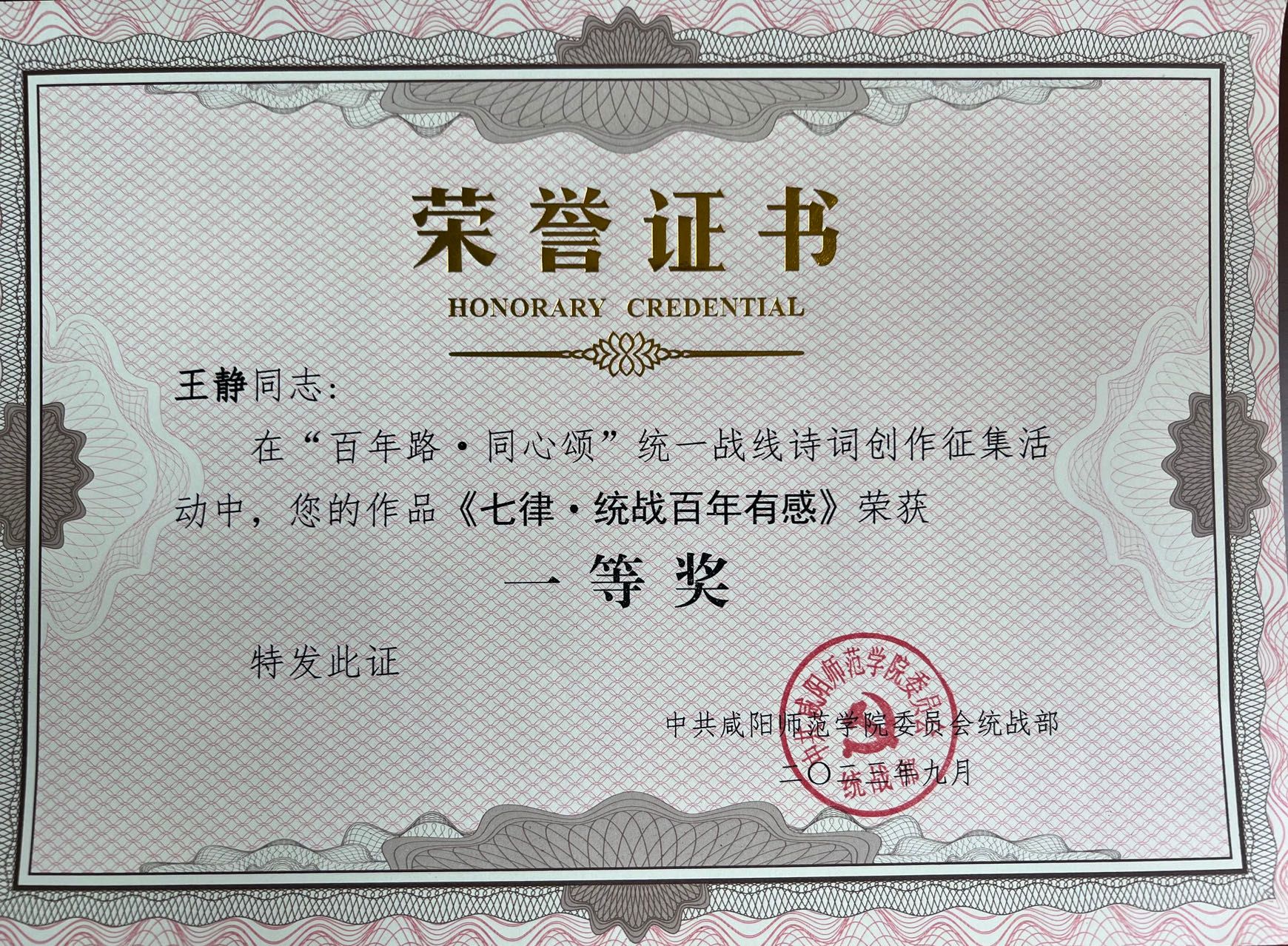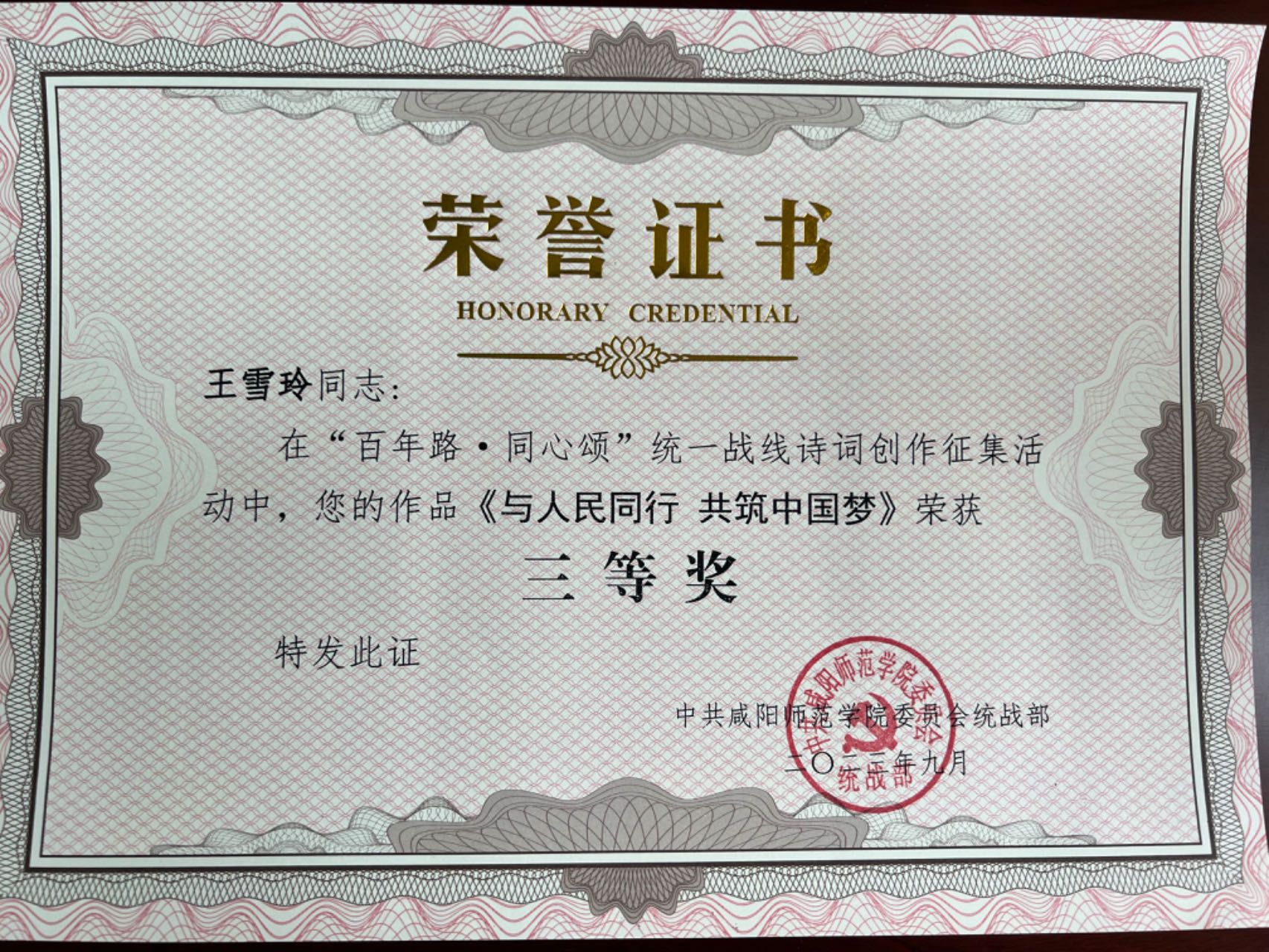 近日,在世俱杯开展的“百年路·同心颂”统一战线诗词创作征集活动中,机关党委第九党支部党员王静同志创作的《七律·统战百年有感》荣获一等奖,第十党支部党员王雪玲同志创作的《与人民同行 共筑中国梦》荣获三等奖。