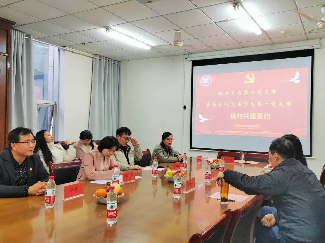 11月14日下午,机关党委第七党支部与音乐学院党委学生第一党支部在艺术楼会议室举行结对共建签约仪式。仪式由音乐学院党委书记祝永昌主持。