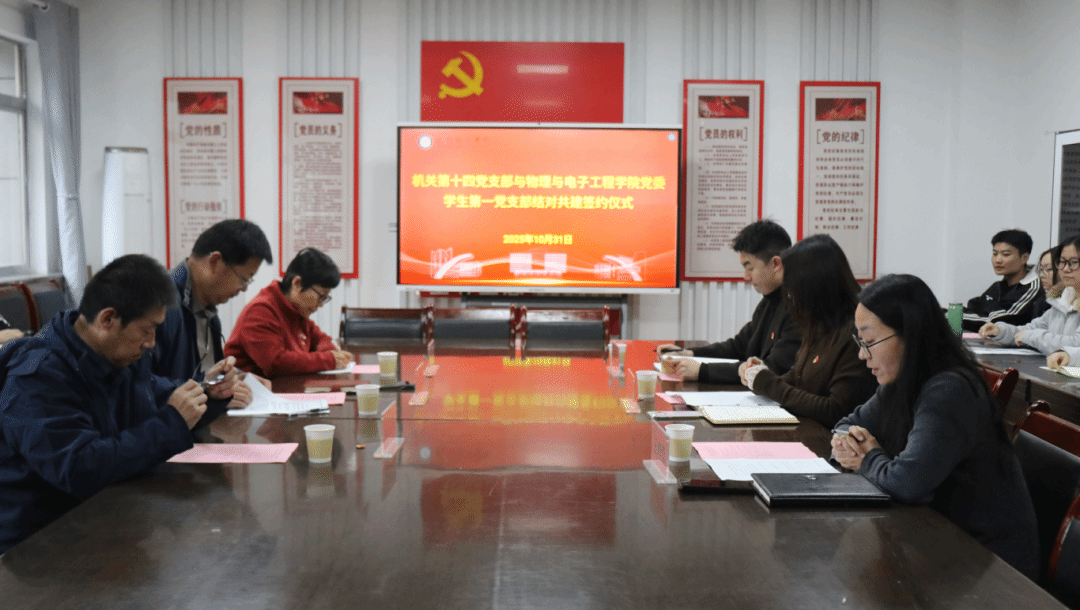 10月31日,机关党委第十四党支部与物理与电子工程学院学生第一党支部在弘道楼217室举行结对共建签约仪式。学院党委副书记王婧莹主持。