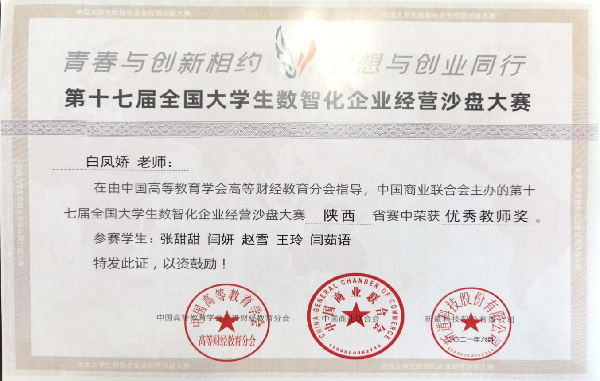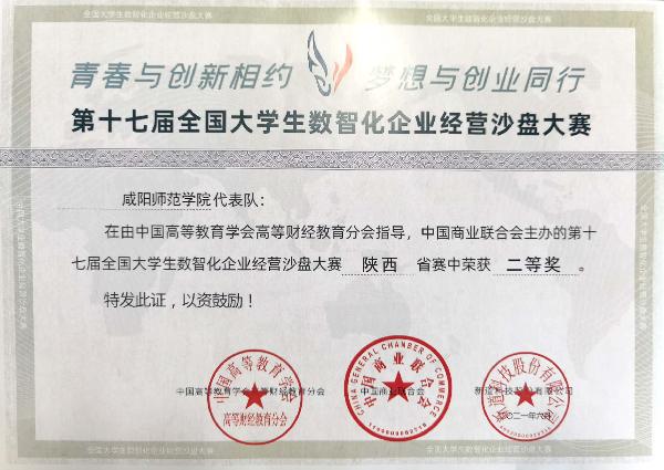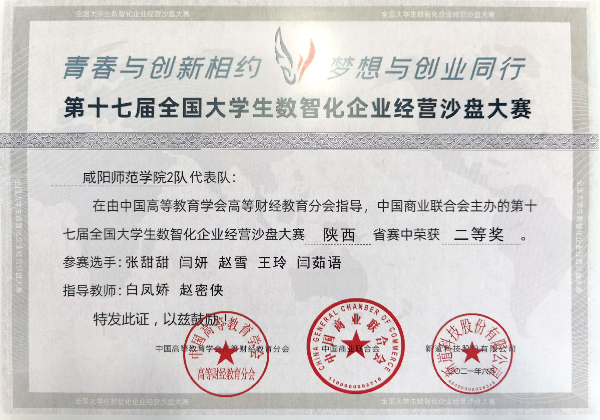 2021年6月19日,第十七届全国大学生数智化企业经营沙盘大赛陕西赛在西安工商学院举行。陕西师范大学、西安石油大学、陕西学前师范学院等26所高校51个代表队255名学生参加比赛。sjb世俱杯官方网站代表队荣获集体二等奖、由经济与管理学院学生组成的sjb世俱杯官方网站2队和1队分别荣获二等奖和三等奖,经济与管理学院教师白凤娇在陕西省赛中荣获优秀教师奖。