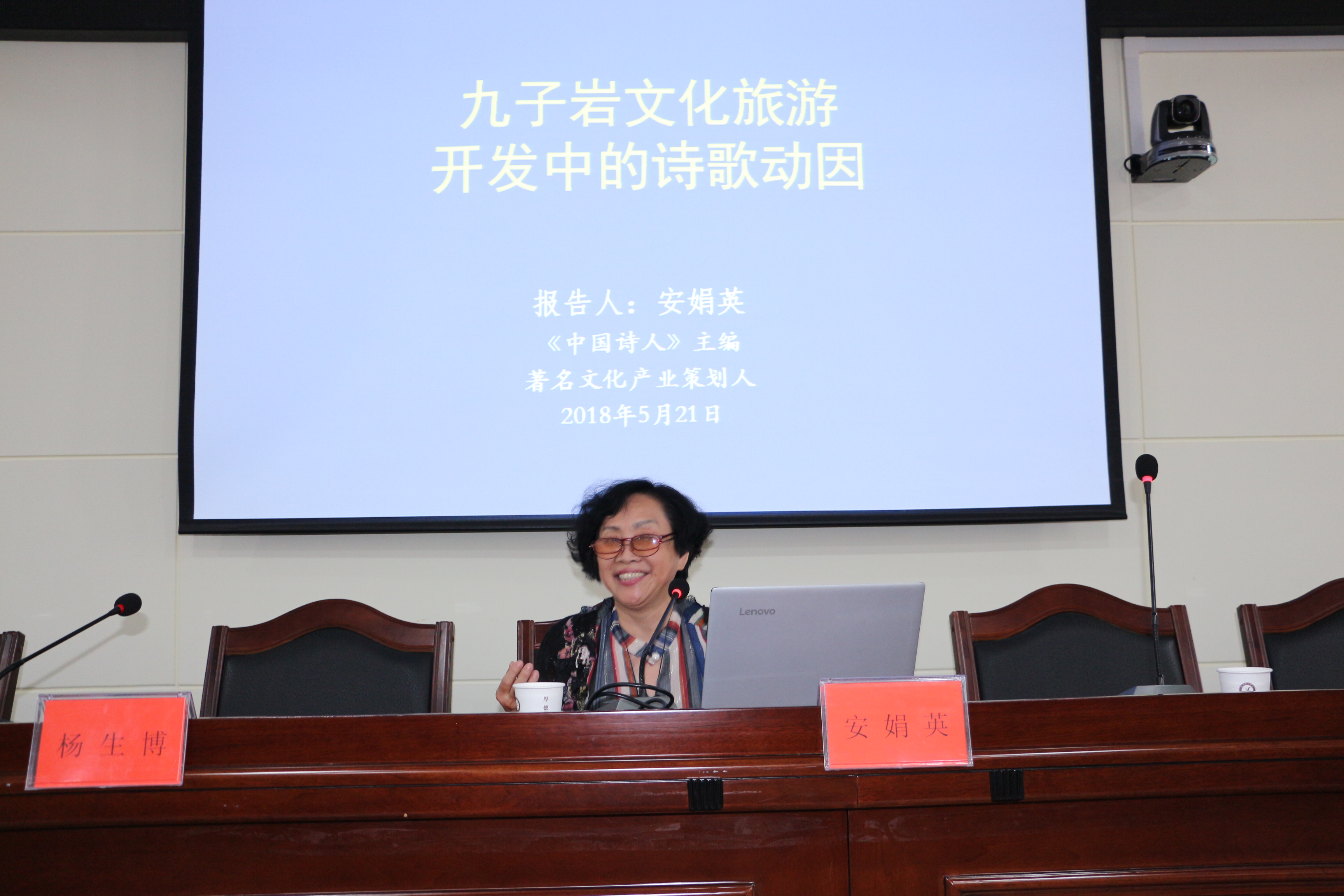 5月21日,著名旅游文化策划人安娟英应邀,以《九子岩文化旅游开发中的诗歌动因》为题为世俱杯做学术报告,经济与管理学院院长杨生博主持报告会。