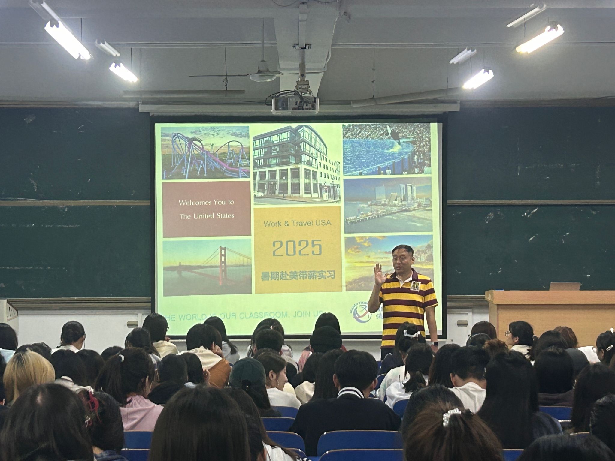 会上,王老师对赴美带薪实习的优势进行了全面分析,他依次介绍了“赴美实习岗位类型、住宿条件、薪资待遇、申请报名的流程以及各项目具体收费等方面的信息,并就该项目的合法性、安全性做出详细介绍,鼓励同学们走出国门,放眼世界,通过出国丰富自己的人生阅历,成为一个全面发展的大学生。随后,外国语学院2022级吴良凤同学分享了自己赴美实习经历,向同学们讲述了在美国的工作、生活日常,以及实习过程中的感悟。