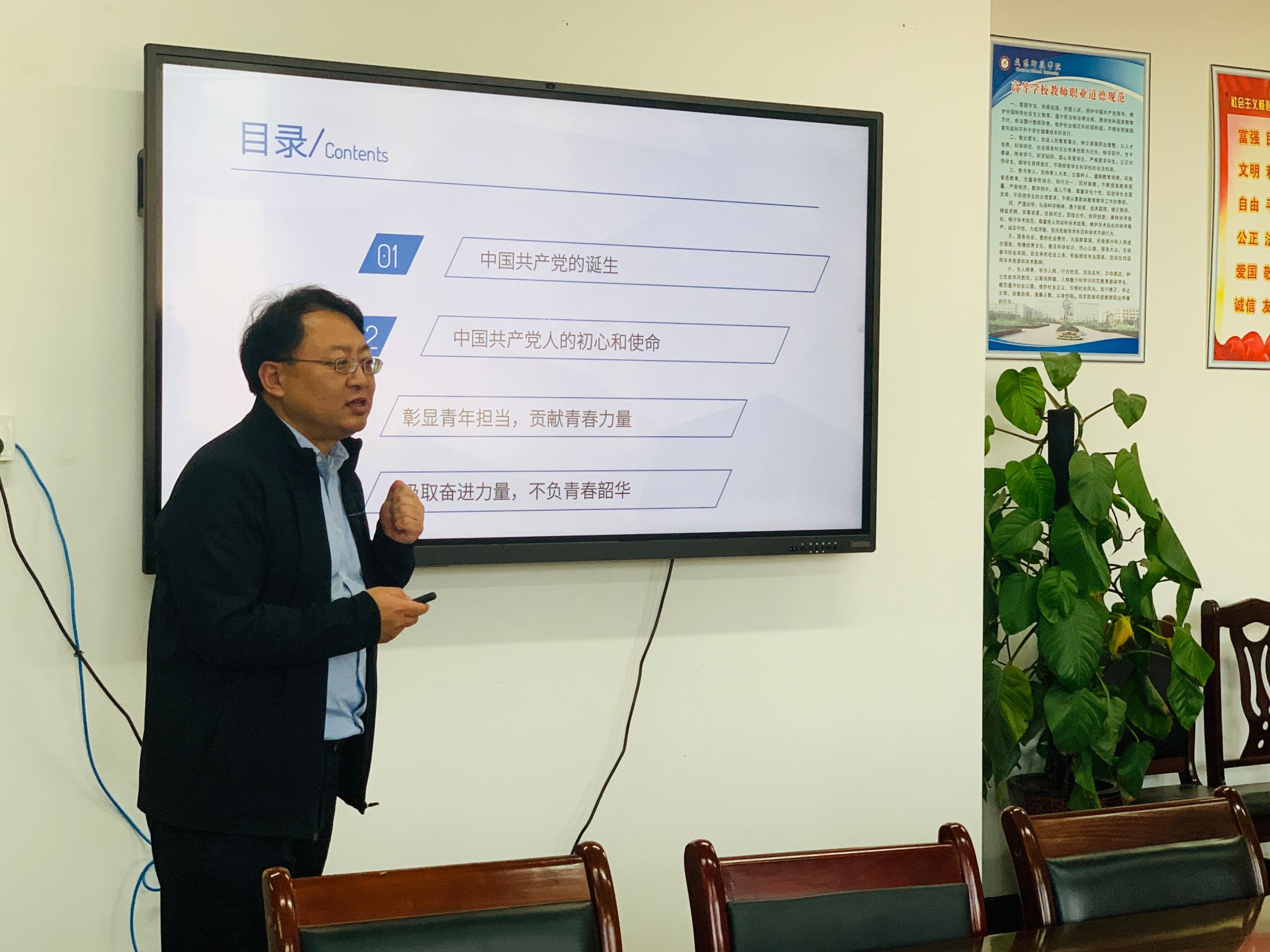 张龙围绕党的发展历程,重点从中国共产党的诞生,中国共产党人的初心和使命,彰显青年担当、贡献青春力量,汲取奋进力量、不负青春韶华四个方面着手,详细阐述了中国共产党的发展历程、红船精神和伟大建党精神,讲述了董存瑞、邱少云等青年英雄故事。用习近平总书记的青春奋斗故事激励青年学生要坚定理想信念、练就过硬本领、投身强国伟业,牢记总书记对青年学子的殷切嘱托,不忘初心,牢记使命,扣好人生第一粒扣子。