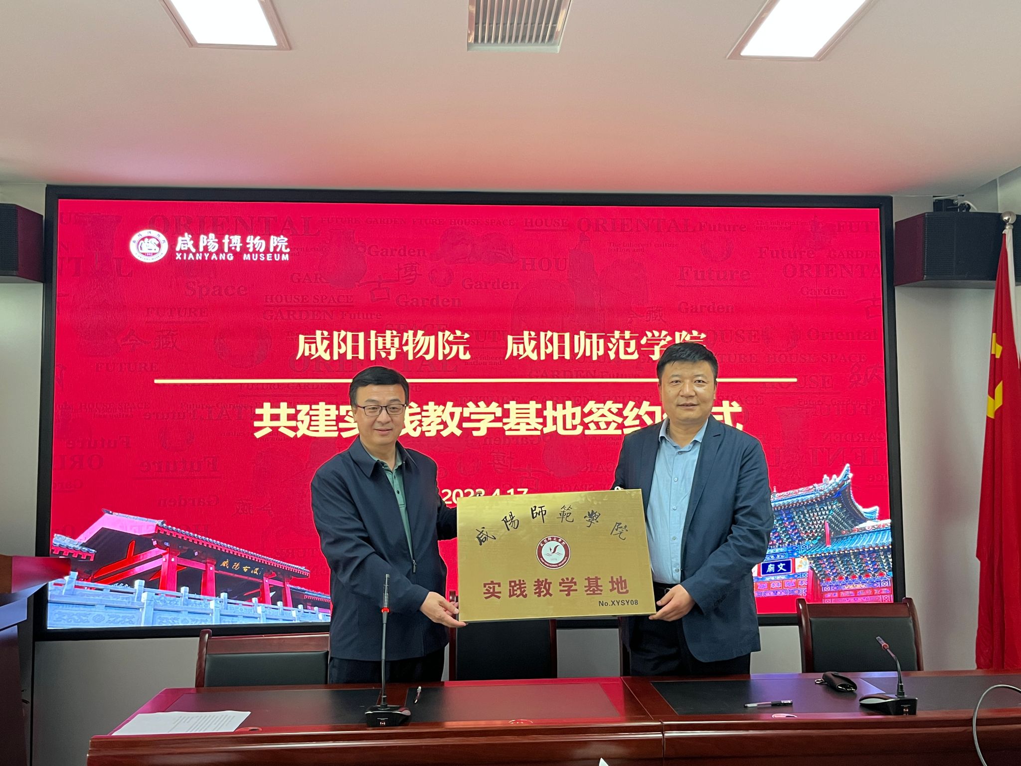 为了加强专业建设,提高人才培养质量,壮大地方文博队伍,根据高等院校学生培养目标及要求,全面提高教学质量,推动校企合作共建,4月17日下午,我院与咸阳博物院在咸阳博物院会议室签订了实践教学基地协议并挂牌。咸阳博物院副院长丁伟、办公室主任谢军美,历史文化学院党委书记段力雄、副院长王永飞博士、文物与博物馆系主任戎岩副教授出席了签约挂牌仪式。