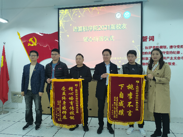 10月21日下午,计算机学院举行2021届校友爱心捐赠仪式。校友会秘书长张高科、计算机学院党政领导、2021届捐赠校友代表徐权佳、邱宇航,校友总会办公室杨华老师及学生代表20人参加捐赠活动,党委副书记李延主持捐赠仪式。