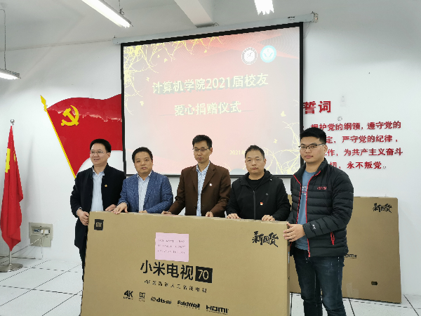 2021届校友徐权佳、邱宇航代表7位校友向母校捐赠了贰台小米70英寸超高清人工智能电视,并表达了回到母校的喜悦之情,感谢母校的培养;表示能为学院发展做一点贡献感到无比荣幸,祝愿母校越来越好。