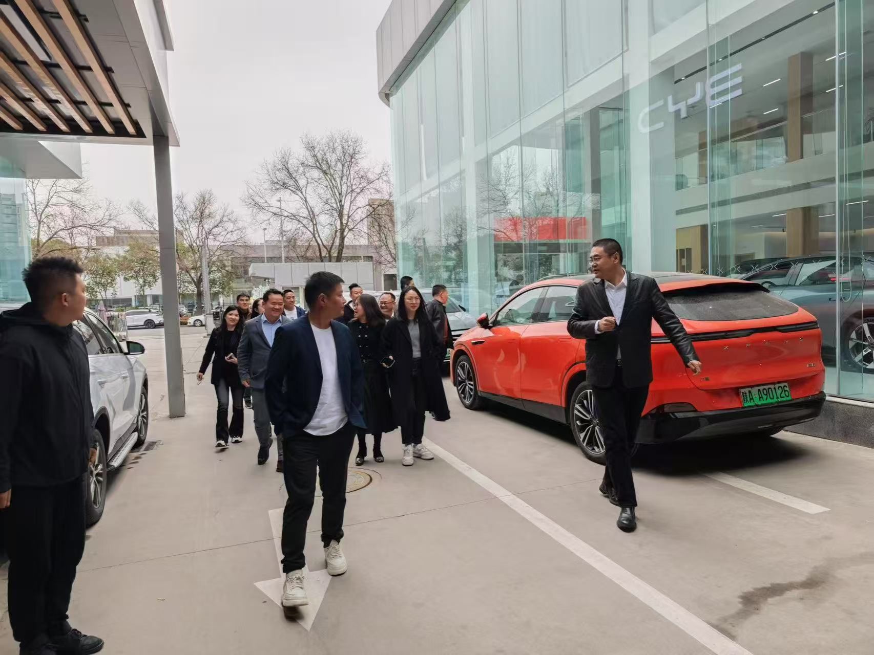 在小鹏汽车西安高新锦业路销售中心4S店门口,大家合影留念,记录这一难忘时刻。